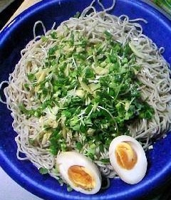 お皿に盛ったそばの上にたっぷりの薬味野菜を乗せて
